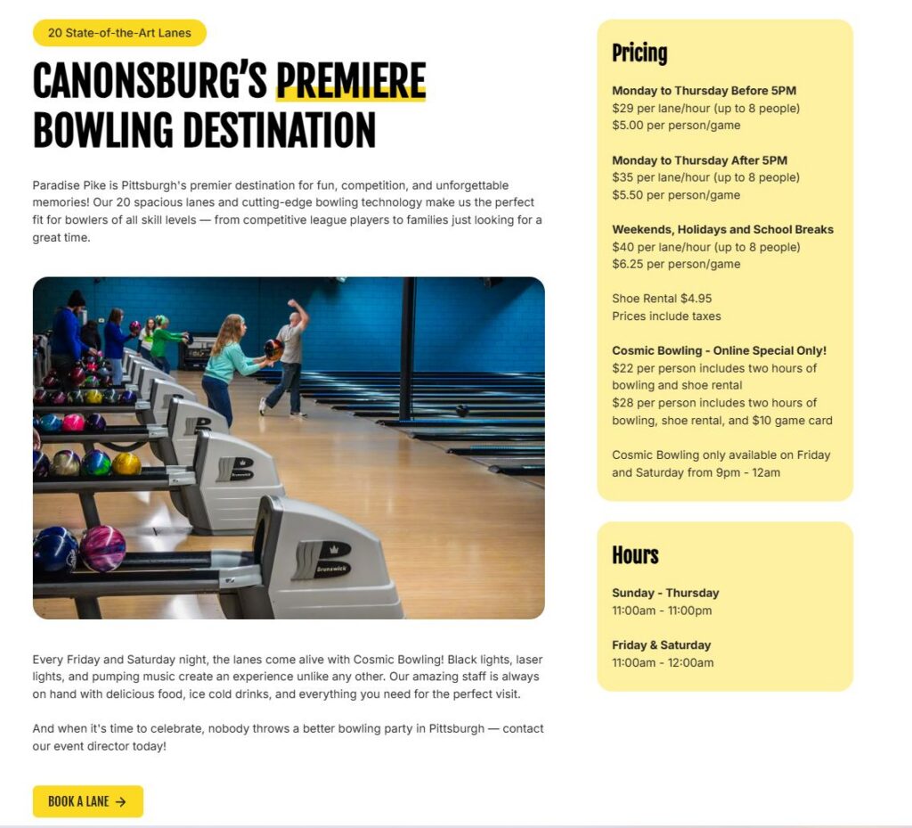 The two sites were deliberately kept on separate domains rather than being merged into one. That’s a smart decision for local search visibility. Google treats each domain as its own entity, which means Paradise Pike can rank independently for searches like “bowling in Canonsburg” while Paradise Island Bowl ranks for “bowling Neville Island.” Combining them into a single site with location pages would have diluted both.