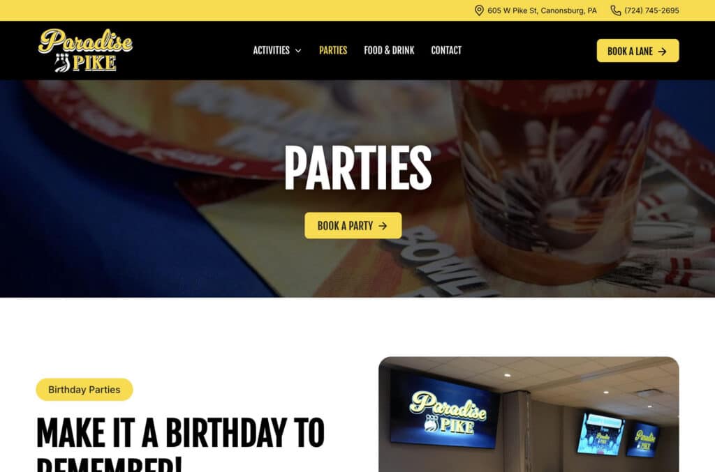 One of the trickiest parts of building a website for a multi-activity entertainment center is information architecture (the way content is organized across pages so that different visitors can find what they need quickly). Paradise Pike has 20 bowling lanes where league players compete multiple nights a week, an arcade packed with games from Marvel Avengers to Jurassic Park and a redemption counter where kids trade in their tickets, a full bar with craft cocktails and beer on tap, a kitchen serving everything from wings to pizzas, birthday party rooms that host kids’ celebrations every weekend, group event packages for corporate outings, and even field trip programs for schools. Each of those offerings appeals to a different person with a different reason for visiting, and the website needs to serve all of them without feeling overwhelming.